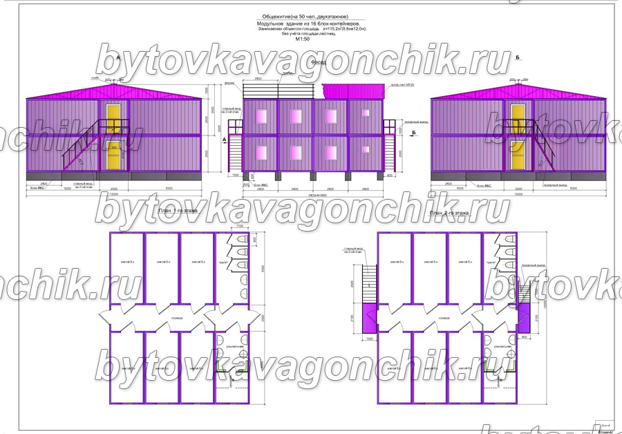 Фасады, план общежития на 50 человек, из 16 шт БК