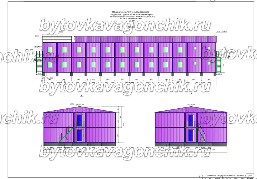 ГлавнаяПроекты готовых решенийМодульные здания → Фасады двухэтажного общежития на 150 человек из 48 шт БК